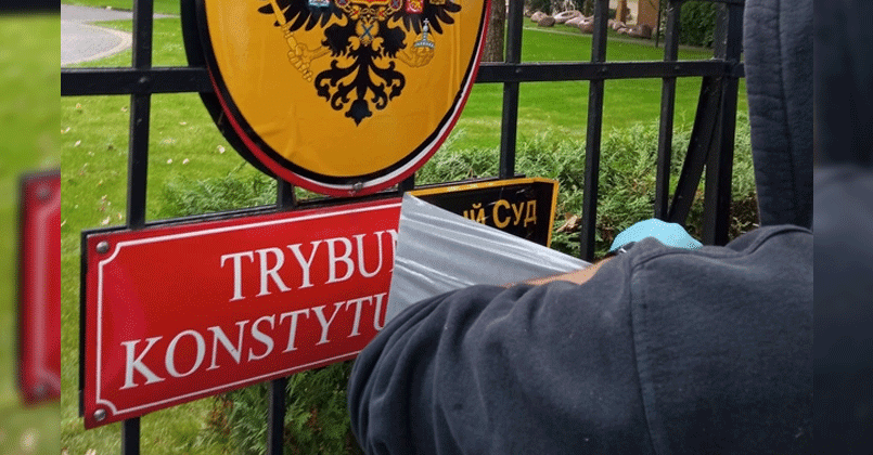 У здания Конституционного суда в Варшаве прошла акция протеста, в ходе которой группа людей проникла на территорию, охраняемую полицией, и подменила герб и информационное табло. Об этом пишет RMF24.